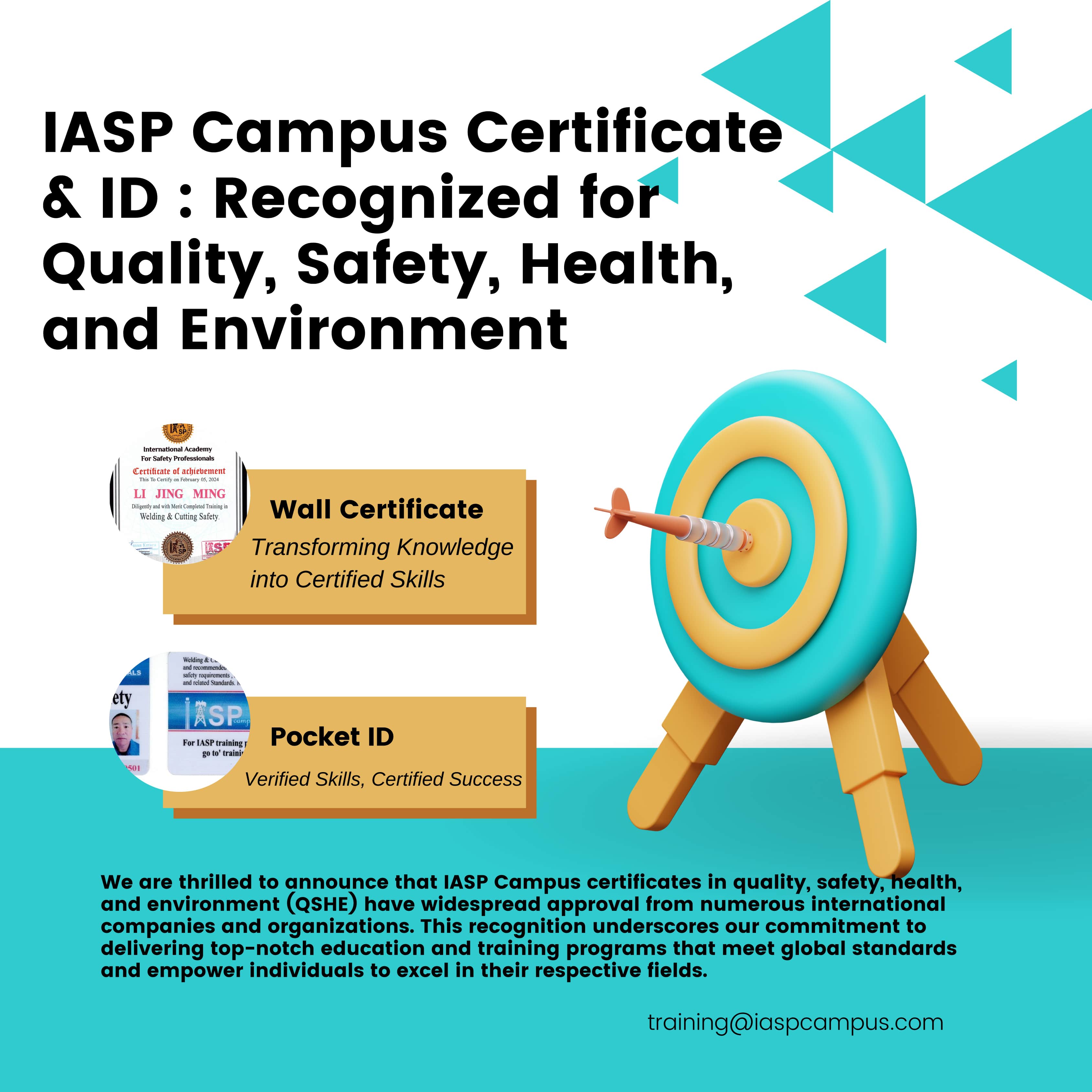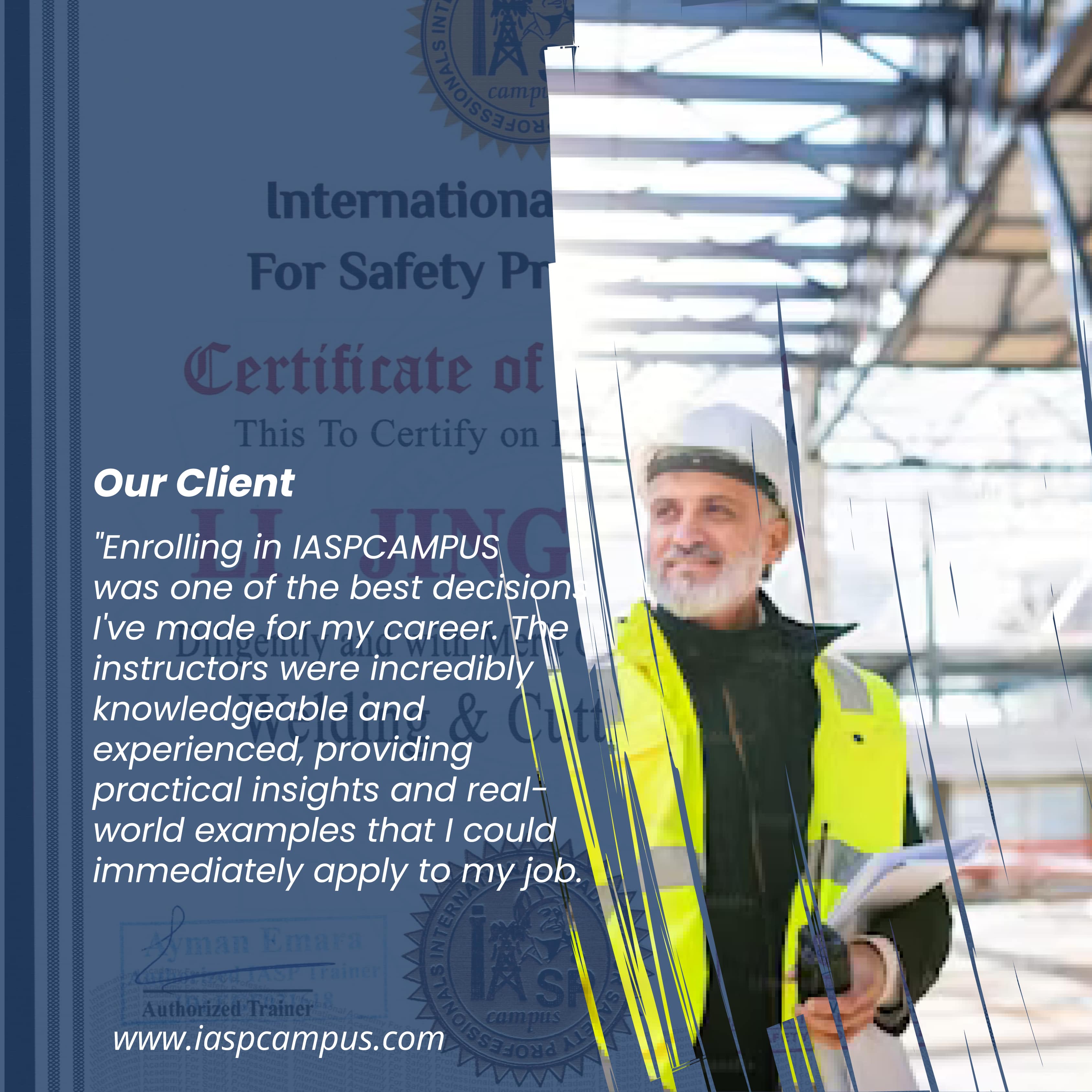 We are thrilled to announce that IASP Campus certificates in quality, safety, health, and environment (QSHE) have widespread approval from numerous international companies and organizations. This recognition underscores our commitment to delivering top-notch education and training programs that meet global standards and empower individuals to excel in their respective fields.